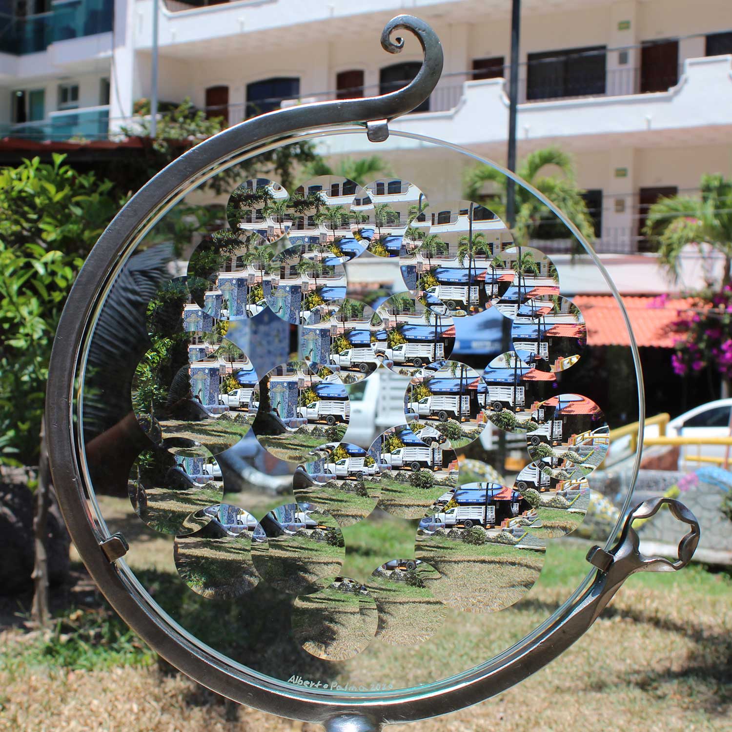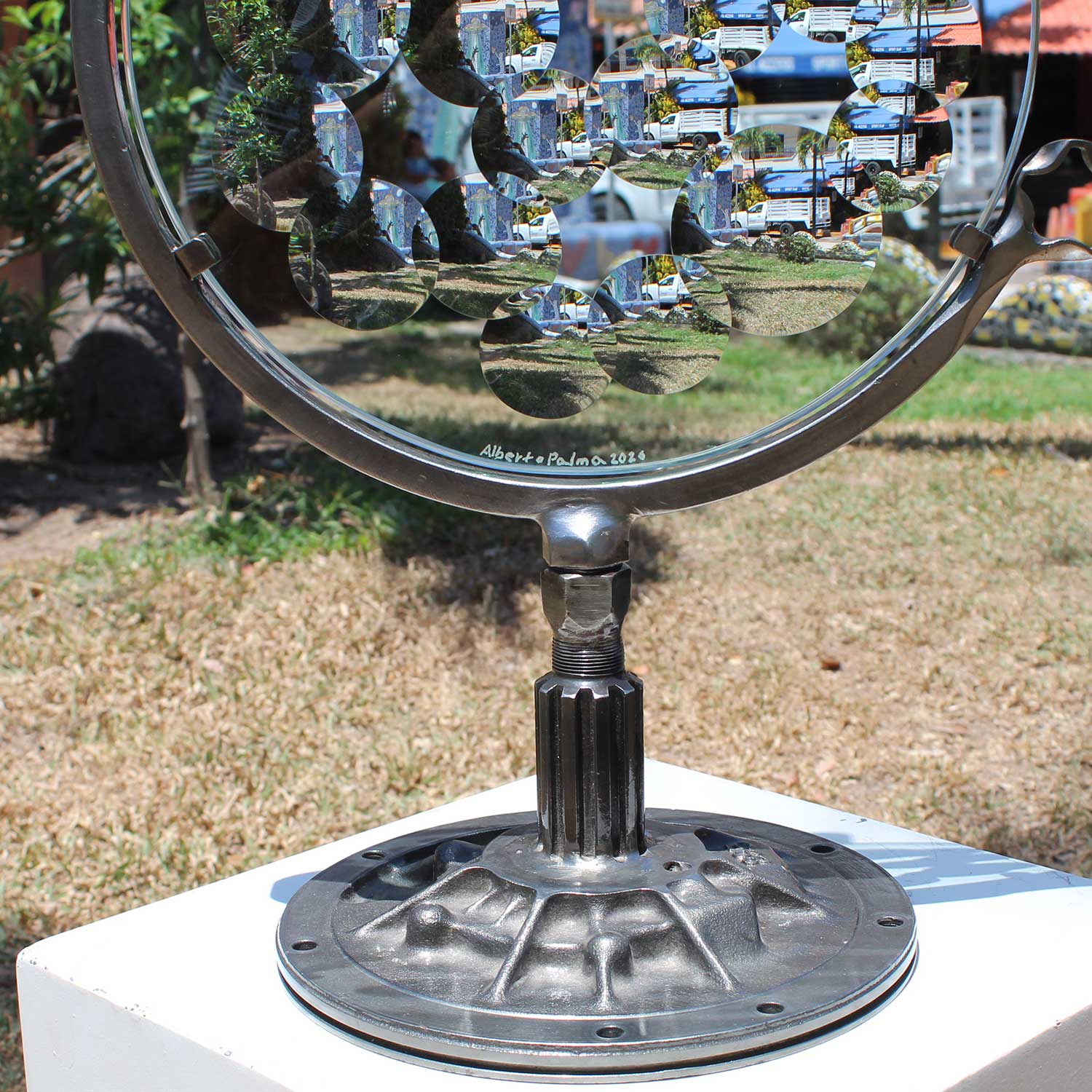 Recycling car parts through careful selection, the design of this Magiscope has come about, aiming to resemble that of a real one as close as possible. Each piece contributes a specifical detail apporting to the finished product. Its completion consist of it being welded, polished and finished with polyurethane three times to protect it from rust & conserve its beauty.